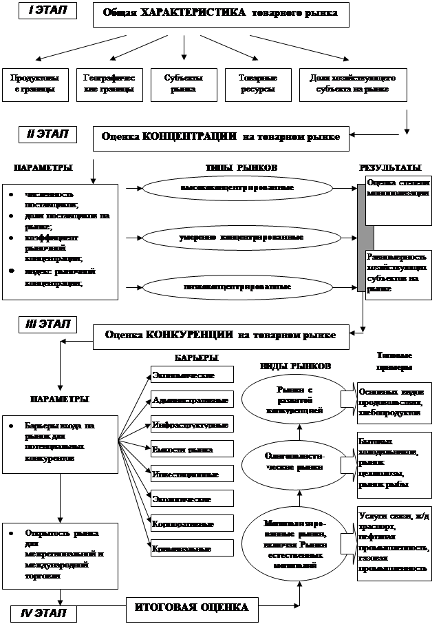 На II этапе производится анализ и оценка различных количественных показателей товарного рынка, а также расчеты, определяющие степень концентрации на товарном рынке. К количественным показателям относятся: - численность поставщиков, действующих на данном товарном рынке; - доли, занимаемые поставщиками на данном товарном рынке; - коэффициент рыночной концентрации (CR) - процентное отношение продаж определенного числа крупнейших поставщиков к общему объему продаж на данном товарном рынке; - индекс рыночной концентрации Герфиндаля-Гиршмана, показывающий сбалансированность фирм на рынке, — сумма квадратов долей, занимаемых на рынке всеми действующими на нем поставщиками. В зависимости от занимаемых продавцами на данном товарном рынке долей можно составить ранжированный перечень, в котором проводится анализ разброса долей участия продавцов и равномерности их присутствия на товарном рынке. В ходе анализа показателей рыночной концентрации (коэффициентов и индексов), могут быть получены следующие результаты: а) выделены три типа рынка: высококонцентрированные, умеренно концентрированные и низкоконцентрированные; б) дана предварительная оценка степени монополизации рынка, равномерности или неравномерности присутствия на нем различных субъектов рынка. На III этапе осуществляется анализ качественных показателей, по которым производится оценка конкуренции на товарном рынке. К ним относятся: — барьеры входа на рынок для потенциальных конкурентов, степень их преодолимости; — открытость рынка для межрегиональной и международной торговли. Под барьерами входа на рынок обычно понимаются любые факторы технологического, административного, экономического характера, которые препятствуют новым фирмам войти на рынок в достаточно короткий период времени. Причем концентрация может и не представлять серьезной опасности для конкуренции в случае отсутствия барьеров входа на соответствующие товарные рынки. Могут рассматриваться следующие препятствия выхода на рынок (барьеры) потенциальных конкурентов: экономические: государственная инвестиционная политика, кредитная, налоговая, ценовая политика, тарифное и нетарифное регулирование внешнеэкономической деятельности; доступность кредитных и бюджетных ресурсов; неплатежи и пр.; административные: устанавливаемые органами исполнительной власти всех уровней процедуры регистрации предприятий, выдачи лицензий на право деятельности, квотирование, ограничения на ввоз и вывоз товаров, предоставление помещений и земельных участков; инфраструктурные: связанные с неразвитостью рыночной инфраструктуры - средства коммуникаций и транспорта, службы по оказанию информационных, консалтинговых, лизинговых и др. услуг; емкость рынка: связанные с ограниченной емкостью рынка — ограничения но спросу, низкая платежеспособность населения; Схема №1