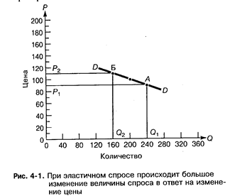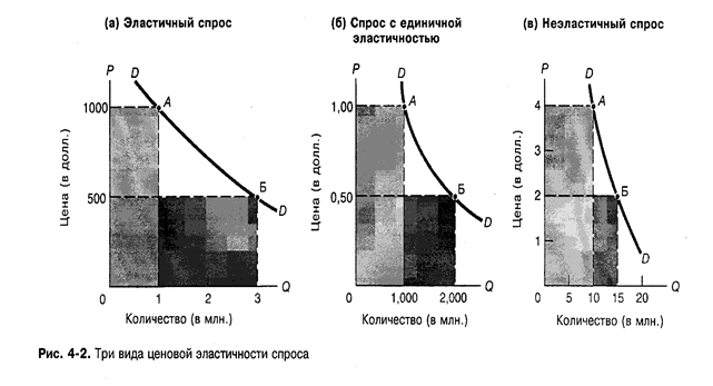 Ценовую эластичность можно с успехом представить в графическом виде. На рис. 4-2 показаны три кривые спроса с различной эластичностью. В каждом случае цены снижаются в два раза и величина спроса потребителей меняется от А к Б.