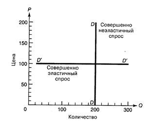 На рис. 4-2(а) снижение цены вдвое приводит к тройному увеличению спроса. Как и в примере на рис. 4-1, мы имеем дело с эластичным по цене спросом. На рис. 4-2(в) сокращение цены в два раза приводит только к 50-процентному росту величины спроса, следовательно, это случай неэластичного спроса. Пограничный случай - кривая спроса с единичной эластичностью - приведен на рис. 4-2(б). Здесь снижению цены в два раза соответствует двойное увеличение величины спроса. Предельные противоположные случаи совершенно эластичного и совершенно неэластичного спроса показаны на рис. 4-3. Совершенно неэластичным является спрос, величина которого абсолютно не меняется при изменении цены. Такой спрос представлен вертикальной кривой спроса. И наоборот, если спрос бесконечно эластичен, ничтожное изменение цены приведет к бесконечно большому изменению величины спроса, как это следует из горизонтальной кривой спроса на рис. 4-3.