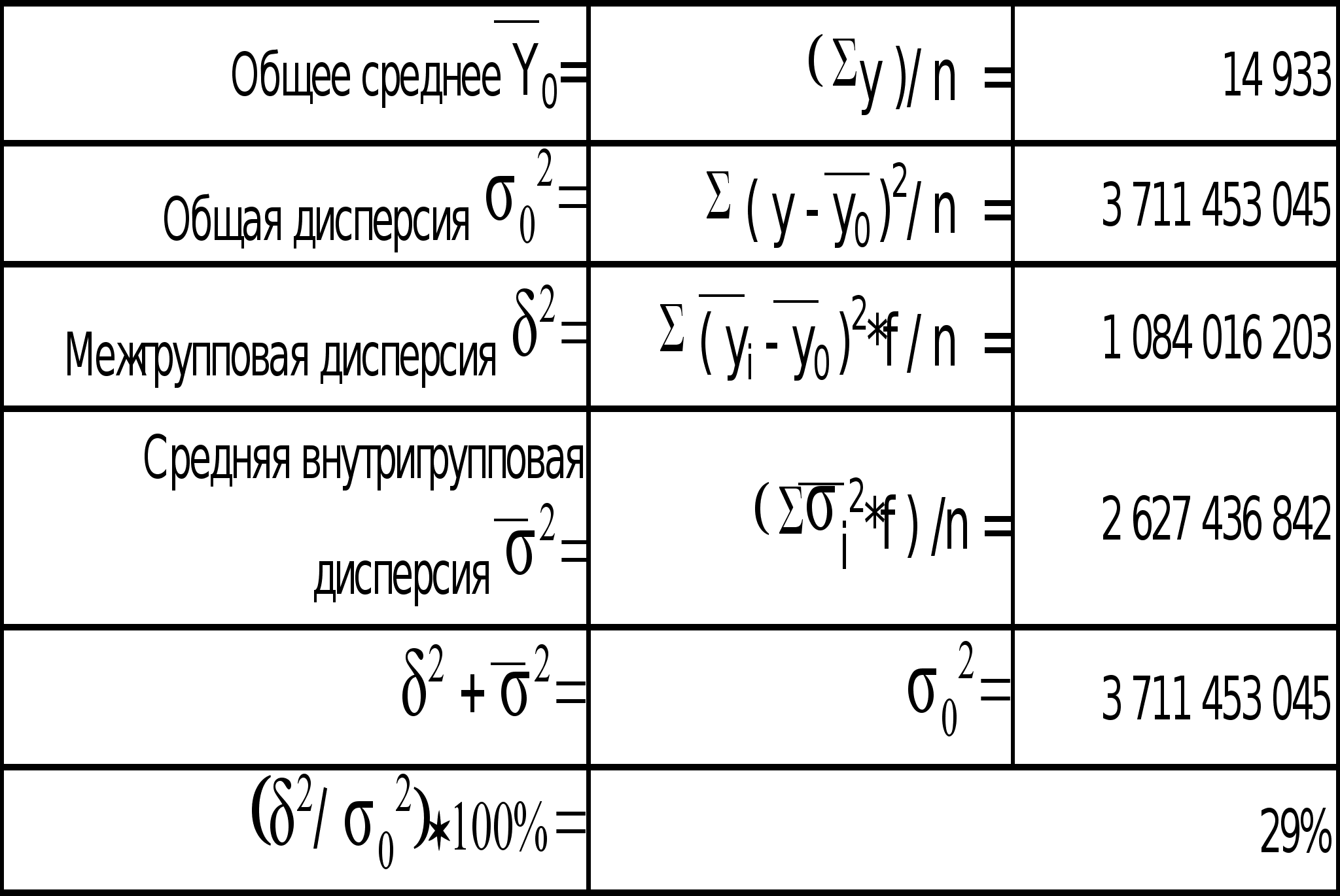 Как видно из данных групповой таблицы, с увеличением величины чистых активов банков уменьшается величина прибыли банков. Эмпирическая линия связи приближается, в общем, к прямой линии. Следовательно, можно предполагать наличие обратной линейной связи. Пункт №2Проверить правило сложения дисперсий и сформулировать вывод о степени влияния факторного признака на величину результативного признака. Нижеследующие показатели были рассчитаны на основе данных групповой таблицы и вспомогательной таблицы (см. приложение 2).