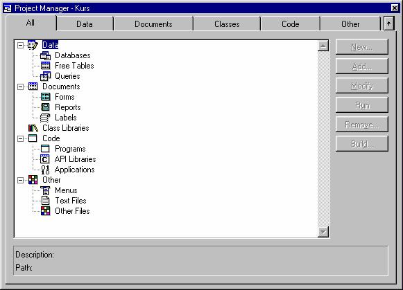 4 Составление программных запросов к базе данных Приступим к программной реализации базы данных. Вообще следует отметить, что в Visual FoxPro существуют 2 пути реализации почти любой задачи: визуальный и программный. В первом случае необходимые действия выполняются с помощью команд меню самого FoxPro и специализированных мастеров. Во втором – с помощью встроенного языка программирования, унаследованного еще от ранних версий. Во всех случаях мы будем пользоваться вторым способом, кроме самого создания базы данных. Дело в том, что на первом этапе необходимо создать так называемый проект Visual FoxPro, в состав которого в дальнейшем будут входить все без исключения используемые нами компоненты. Для большей наглядности желательно создавать проект “вручную”. Кроме того, существуют 2 вида таблиц FoxPro: свободные и связанные, т.е. входящие в состав баз данных. Наша таблица относится ко второму типу, в то время как команда CREATE TABLE создает свободную таблицу. С учетом этого, создание базы данных проведем визуально, а все остальные манипуляции – программно. 4.1 Создание базы данных База данных создается с помощью Диспетчера проектов Visual FoxPro. Сначала создадим новый проект. Назовем его Kurs и разместим его в папке MyProject.