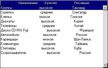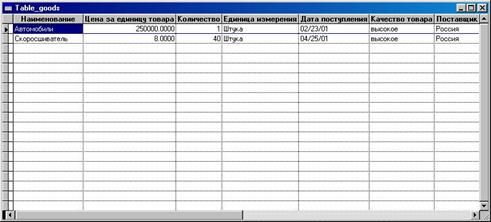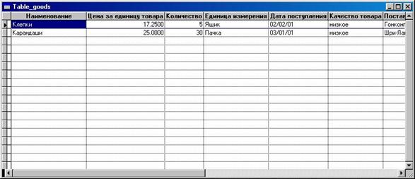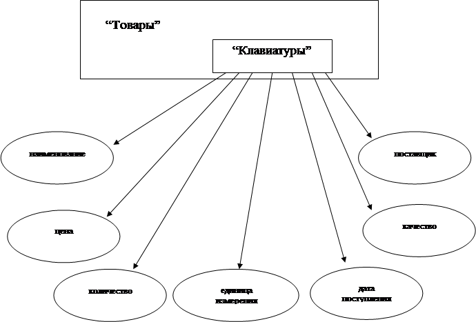 Рисунок 1.1.1 – Диаграмма “объекты - связи”. 2 Составление словаря данных На основании модели данных составим словарь данных. Словарь данных – это система, в которой хранятся сведения об объектах, их атрибутах, о значениях и форматах представления данных. Опишем назначение и свойства полей реляционной таблицы “товары”. – Наименование товара. Служит первичным ключом, по которому можно получить доступ к любой строке таблицы. Тип данных – строковый (Character), длина – 20 символов. Ширина поля – 20 символов. Возможные значения – названия товаров, имеющих отношение к офису. – Цена единицы товара. Хранит цену определенного вида товаров. Тип данных – денежный (Currency) точностью до 4 знаков после запятой. Ширина поля – 8 символов. Возможные значения ограничены шириной поля. – Количество единиц товара. Хранит число единиц товара, находящихся в данный момент на складе. Тип данных – целый (Integer). Ширина поля – 4 символа. Возможные значения ограничены шириной поля. – Единица измерения. Хранит название единицы измерения товара. Тип данных - строковый (Character), длина – 15 символов. Ширина поля – 15 символов. Возможные значения – в соответствии с первым полем таблицы. – Дата поступления. Хранит число, месяц и год поступления товара. Тип данных – выражение даты (Date). Ширина поля – 8 символов. Возможные значения записываются в формате: мм/дд/гггг, где мм – номер месяца (01..12), дд – день (01..31), гггг – номер года. – Качество товара. Хранит условную оценку качества поступившего товара. Тип данных – строковый (Character), длина – 7 символов. Ширина поля – 7 символов. Возможные значения – ‘высокое’, ’среднее’, ’низкое’. – Поставщик. Хранит название страны – производителя данного товара. Тип данных – строковый (Character), длина – 20 символов. Ширина поля – 20 символов. Возможные значения ограничены корректными названиями стран. 3 Составление структуры базы данных На основании диаграммы и словаря данных составим структуру базы данных “Goods”. Поскольку на диаграмме изображено только одно объектное множество, то, следовательно, в базу данных будет входить только одна реляционная таблица. Перечислим и дадим названия полям таблицы “Table_Goods” в соответствии с диаграммой: Таблица 3.1 – Поля таблицы “Table_Goods”