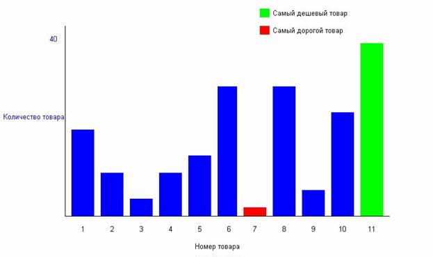 Рисунок 4.4.2 – Сообщение, выдаваемое по Alt+F1. 4.5 Изучение графических возможностей FOX PRO содержит средства создания изображений из элементов псевдографики: @ <Y1,Х1,Y2, Х2> BOX <вырC>. Команда формирует в заданных координатах рамку фон прямоугольника из любых символов, которые включены в <вырC>. Это символьное выражение может содержать до 9 символов (по 4 символа для углов и сторон прямоугольника, начиная с левого верхнего угла по часовой стрелке). @ <Y1,Х1> TO <Y2,X2>[DOUBLE/PANEL/<окантовка>] – команда формирует рамку с координатами X1, Y1 и X2, Y2. @ <Y,Х> SAY <текст> – команда выводит текст, начиная с координат X,Y. Для задания цвета во всех вышеприведенных командах используется опция COLOR с указанием необходимой цветовой схемы. Причем при описании цвета необходимо указать не только цвет элемента, которого мы хотим нарисовать, но и цвет фона, на котором производится рисование (в нашем случае – белый). В задании необходимо построить диаграмму количества товаров. Из-за недостатка места выведены не названия, а номера товаров. При этом столбец, относящийся к самому дорогому товару, нарисован красным цветом, а к самому дешевому – зеленым, о чем сказано в легенде. Полный текст программы приведен в приложении Г, а результат работы – на рисунке 4.5.1.
