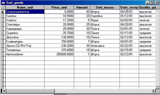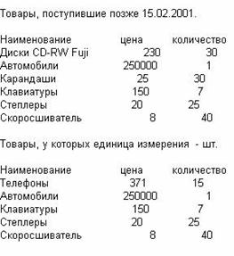 PARAMETERS <список параметров> Совокупность команд, составляющих внутреннюю процедуру, должна начинаться командой PROCEDURE <имя процедуры> Для обозначения конца процедуры с возратом в вызывающий модуль может использоваться команда RETURN, хотя она и не обязательна. По заданию требуется, используя модули, вывести сведения о товарах, поступивших позже 15.02.2001, а также вывести сведения о товарах, у которых единица измерения – шт. Полный текст программы приведен в приложении Д, а результат работы – на рисунке 4.6.1.