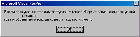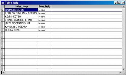 Рисунок 4.7.1 – Таблица данных для помощи. Для вызова процедуры помощи применена команда ON KEY LABEL. В процедуру Helper передается один параметр – имя поля исходной таблицы товаров, которое требуется пояснить. Функция VARREAD() возвращает имя переменной памяти, элемента массива или поля (прописными буквами), использованного для создания текущего элемента управления. В процедуре осуществляется поиск по этому полю, и, если таковое найдено, соответствующее MEMO-поле выводится с помощью процедуры MESSAGEBOX. Полный текст программы приведен в приложении Е, а пример экрана помощи, выдаваемого пользователю при нажатии клавиши F1 в тот момент, когда курсор находится в поле “Дата поступления” исходной таблицы, приведен на рисунке 4.7.2.