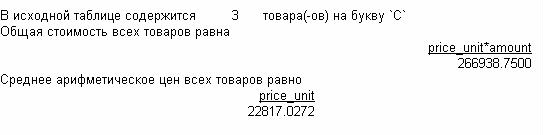 Рисунок 4.7.2 – Пример экрана помощи. 4.8 Создание новых таблиц и арифметические действия При копировании открытого файла DBF в новый файл, который этой командой создаётся, используется команда COPY TO <имя нового файла> [<границы>] [FIELDS <поля>] [FOR < условие>] [WHILE <условие>] [TYPE <тип файла>] [WITH CDX] В новый файл могут копироваться как все поля базы данных, так и только перечисленные в списке FIELDS. Копируемые поля могут находиться не только в файле из рабочей активной области, но и в любом другом файле БД из других рабочих областей. В этом случае имена полей – составные (имя базы и имя поля). Существует команда, выполняющая физическое упорядочение файла: SORT TO <имя нового файла> [ASCENDING/DESСENDING] ON <поле> [/A] [/D] [/C] [,<поле> [/A] [/D] [/C]...] [<границы>] [FOR <условие>] [WHILE <условие>] [FIELDS <список полей>] Команда создает из активной БД новый файл , в котором записи расположены в возрастающем (/А) или убывающем (/D) порядке относительно указанного поля /полей. Если параметр сортировки не указан, по умолчанию подразумевается /А - возрастание. Ключ /С означает, что при сортировке будет игнорироваться регистр букв (строчные /заглавные). Допускается соединение ключа С с другими ключами, например /DC. Для выполнения арифметических операций с базой данных можно использовать следующие команды: COUNT [<границы >][WHILE <условие>] [FOR <условие>][TO <переменная>] По команде COUNT подсчитывается число записей в заданных границах, удовлетворяющих условиям, которое заносится в указанную <переменную>. SUM [<границы>][WHILE <условие>] [FOR <условие>] <список выражений> [ТО <переменные>/ТО ARRAY <массив>] По команде SUM суммируются значения перечисленных числовых полей указанные <переменные> или <массив>. В списке выражений разрешается указывать не только имена числовых полей, но и функции от них и функции от нескольких полей одновременно. Это значит, что можно воспользоваться функцией STR() и просуммировать символьные поля с цифровыми данными. Можно просуммировать квадратные корни величин и т.д. Если <переменных> не было к моменту исполнения команды, то они будут созданы, однако <массив> должен уже существовать. AVERAGE [<границы>][WHILE <условие>] [FOR <условие>] <список выражений> [TO <переменные>/TO ARRAY <массив>] По этой команде подсчитывается среднее арифметическое при тех же допущениях, что и для предыдущей команды. По условию требуется: – Создать файл New_goods с полями Name_unit, Price_unit, Amount, Unit_measure для всех товаров с ценой > 50; – Создать файл Sort_goods с полями Name_unit, Price_unit, Amount, Quality_goods. Файл отсортировать по полям: Price_unit – по возрастанию, Name_unit – по алфавиту; – Подсчитать число товаров на ’С…’, общую сумму всех товаров и среднее арифметическое цены товаров. Следует отметить, что сложная сортировка в данном задании отличается от индексации во втором задании. При упорядочении первое указанное поле является основным. В нашем случае это цена. Если же в таблице встретятся несколько строк, в которых будет совпадать цена, то в силу вступает второй параметр – а именно, товары с одинаковой ценой будут отсортированы по алфавиту. В таблице Table_Goods записи с одинаковой ценой отсутствуют, поэтому продемонстрировать сортировку по алфавиту одновременно с сортировкой по цене не представляется возможным. Полный текст программы приведен в приложении Ж, а результаты работы программы – на рисунках 4.8.1 – 4.8.3.