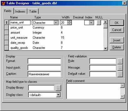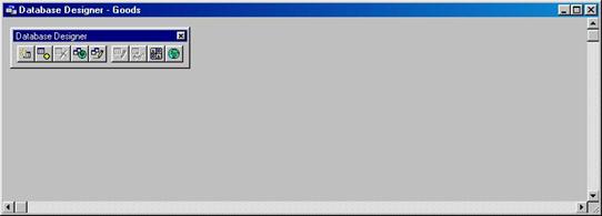 Рисунок 4.1.2 – Окно Дизайнера баз данных С помощью Дизайнера баз добавим в проект таблицу. После присвоения имени новой таблице создаем ее структуру в соответствии с заданием. Структура таблицы представляет собой список полей и их характеристику: тип данных, размер, длину символьного представления (для типа Character) и др. В поле “Caption” можно указать надпись-заголовок столбца для каждого поля, которая будет высвечиваться при отображении таблицы.