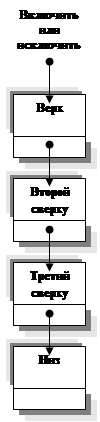 Стек в виде списка (pushdown list) – стек, организованный таким образом, что последний вводимый в область памяти элемент размещается на вершине списка. Из стека мы всегда исключаем "младший" элемент из имеющихся в списке, т. е. тот, который был включен позже других. Для очереди справедливо в точности противоположное правило: исключается всегда самый "старший" элемент; узлы покидают список в том порядке, в котором они в него вошли. Стеки очень часто встречаются в практике. Простым примером может служить ситуация, когда мы просматриваем множество данных и составляем список особых состояний или объектов, которые должны обрабатываться позднее; когда первоначальное множество обработано, мы возвращаемся к этому списку и выполняем последующую обработку, удаляя элементы из списка, пока список не станет пустым. Для этой цели пригодны как стек, так и очередь, но стек, как правило, удобнее. При решении задач наш мозг ведет себя как "стек": одна проблема приводит к другой, а та в свою очередь к следующей; мы накапливаем в стеке эти задачи и подзадачи и удаляем их по мере того, как они решаются. Аналогично процесс входов в подпрограммы и выходов из них при выполнении машинной программы подобен процессу функционирования стека. Стеки особенно полезны при обработке языков, имеющих структуру вложений. К ним относятся языки программирования, арифметические выражения и немецкие "Schachtelsatze" /буквально "вложенные предложения"/. Вообще, стеки чаще всего возникают в связи с алгоритмами, имеющими явно или неявно рекурсивный характер.