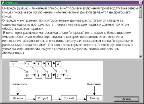 При нажатии на кнопку «Удалить» удаляется элемент из списка. В однонаправленном, двунаправленном и циклическом списках удаляется тот элемент, на который указывает указатель. В очереди и стеке удаляется первый. При удалении элемента из дека появляется окно «Удаление элемента», в котором вам предлагается выбрать откуда удалять элемент из начала или с конца. При нажатии на кнопку теория (для очереди) открывается окно «Очередь», котором изложена теория и даны примеры.