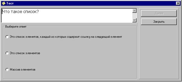 Сверху вопрос, ниже варианты ответов. После выбора ответа кнопка «Далее» становится активной, нажав на нее появляется следующий вопрос. После выполнения теста выдается оценка, если неудовлетворительная то открывается окно «Лабораторные работы». Примечание: после того как тест запустился вызов теста становится неактивным т.е. второй раз учащийся запустить тест не сможет. Закрыть программу можно нажатием на кнопку «Закрыть» или F10. ЗаключениеВ квалификационной работе мы попытались раскрыть более полно и наглядно понятие линейного списка, однонаправленного и двунаправленного списков, стека, дека и очереди. Сформировать и закрепить познавательный интерес к данной теме у учащихся. Выявлять и развивать творческие способности в использовании полученного навыка при программировании. Главной целью нашей работы было знакомство с теоретическим материалом, касающийся информационных структур и разработка программного средства «Динамические типы данных». Достижением этой цели и согласно поставленной гипотезы определялись следующие задачи: 1. Изучить литературу по теме динамические информационные структуры, педагогическую и методическую по теме исследования; 2. Проанализировать виды динамических информационных структур; 3. Разработать факультатив по теме исследования; 4. Разработать программный продукт по теме исследования. Все поставленные цели и задачи реализованы в данной квалификационной работе. Изучено понятие линейного списка, всевозможные операции с этим списком, определяются основные термины и понятия. Кроме того, рассматривается более конкретно и полно каждый список в отдельности и показывается целесообразность использования списков в тех или иных случаях. Для каждого списка приводятся жизненные примеры для простоты восприятия. Дается понятие связанного распределения и кратко изучается понятие динамических информационной структуры, которая позволяют применить полученные знания при программировании. Также рассматривается преимущество и недостатки двух форм представления информации: связанное и последовательное. Далее следует методическая часть, в которой представлена расчасовка факультатива, его структура, и поставлены цели и задачи факультатива. Приводится для примера три конспекта уроков по теме «Очередь», «Стек» и «Тест». И последнее это руководство пользователя, в котором дается описания работы с демонстрационной программой. Литература1. Айен Синклер «Большой толковый словарь компьютерных терминов», М.: 1998 г. 2. Архангельский А. Я. «Программирование в Delphi 4», М.: 1999 г. 3. Архангельский А. Я. «Программирование в Delphi 5», М.: 2000 г. 4. Вирт Н. «Алгоритмы и структуры данных», Москва Изд. Мир, 1989 г. 5. Гудмэн Д. «Управление памятью для всех», Киев 1995 г. 6. Зубов В. С. «Справочник программиста», М.: 1999 г. 7. Кнут Д. «Искусство программирования для ЭВМ», т.1 Основные алгоритмы, Изд. Мир М.: 1976 г. 8. Кормен Т. и другие «Алгоритмы построения и анализ», М.: 2000 г. 9. Подласый И. П. Учебник для студентов высших педагогических учебных заведений, М.: Просвещение 1996 г. 10. Усова А. В. «Формирование у школьников понятий в процессе обучения», М.: Педагогика, 1986 г. Приложение 1. (Листинг программы)В листинге приведены только три основных модуля. В первом модуле описан интерфейс программы, обработка всех событий. Второй модуль, отвечай за формирован