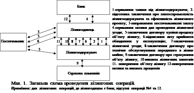 Отже, для здійснення лізингових операцій банк-лізингодавець проводить попередню організаційну роботу з вивчення лізингового ринку, його основних тенденцій, виявлення попиту на певні види устаткування, проведення рекламної кампанії про свою діяльність. Ініціатива в укладанні лізингової угоди надходить, як правило, від лізингоодержувача. Разом з тим лізингоодержувач може звернутися до лізингодавця з проханням підібрати постачальника майна, хоча останнє слово залишається за лізингоодержувачем. Подальші відносини між сторонами базуються на основі заявки від лізингоодержувача на купівлю майна і передачу його у тимчасове користування. Заявка повинна містити назву підприємства, технічні характеристики, кількість одиниць обладнання, його економічні параметри, назву підприємства-виробника (постачальника) об’єкта лізингу, пропозиції по сплаті та ін. Одночасно із заявою потенційний лізингоодержувач надає банку-лізингодавцю копію свого статуту та всю необхідну інформацію про свій економічний стан та перспективи його розвитку. В свою чергу лізингодавець здійснює перевірку платоспроможності свого ймовірного клієнта та аналіз лізингового проекту з точки зору можливості повторної здачі майна у лізинг чи його продажу у випадку дострокового розірвання угоди. При оцінці платоспроможності лізингоодержувача банк може користуватися загальною схемою, прийнятою для оцінки платоспроможності своїх клієнтів; але його передусім цікавить здатність лізингоодержувача виконувати свої зобов’язання на перспективний період, що ускладнює цей аналіз, включаючи до нього крім коефіцієнтів покриття, ліквідності та додаткових показників кредитоспроможності аналіз загальної економічної стійкості підприємства, можливості технічного переозброння, оновлення асортименту продукції і т.ін. Далі у випадку прийняття позитивного рішення про укладання лізингової угоди банк-лізингодавець заключає з постачальником договір купівлі-продажу і направляє постачальникові замовлення-наряд на поставку об’єкта угоди. У ньому повинна бути вказана назва, місце розташування та номер розрахункового рахунку лізингодавця, опис обсягів робот, строків їх виконання, вартість робіт, порядок їх здачі-прийняття та ін. Як правило, паралельно відбувається і юридичне оформлення лізингової угоди. Основним документом лізингової угоди є договір лізингу. Він укладається між лізингодавцем та лізингоодержувачем про надання останньому в тимчасове користування за плату для підприємницької діяльності об’єкта лізингу. Цей договір має бути укладений у письмовій формі і містити дані про: - найменування сторін; - об’єкт лізингу; - строк, на який укладається договір; - доставку і прийом в експплуатацію об’єкта лізингу; - розмір та порядок сплати лізингових платежів; - використання та утримання обладнання; - умови повернення об’єкта лізингу; - умови страхування об’єкта лізингу; - права та обов’язки сторін; - відповідальність сторін; - порядок вирішення спірних питань; - форс-мажорні обставини; - різне та додатки. Лізинговий договір вступає в силу тільки з дати підписання акту прийому обладнання як об’єкта угоди в експлуатацію (додаток №4). Після підписання акту прийняття обладнання в експлуатацію банк-лізингодавець зобов’язується провести загальну оплату вартості пос