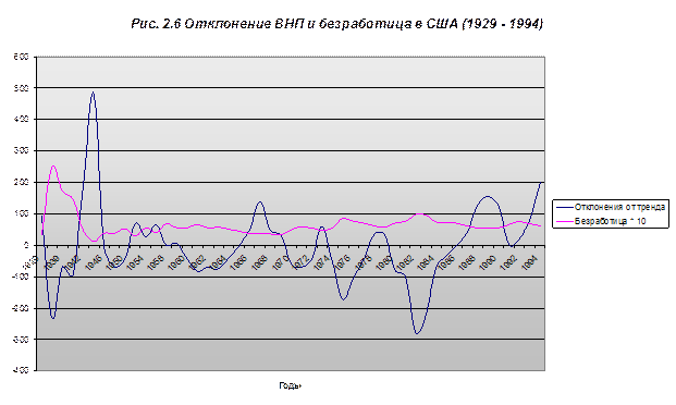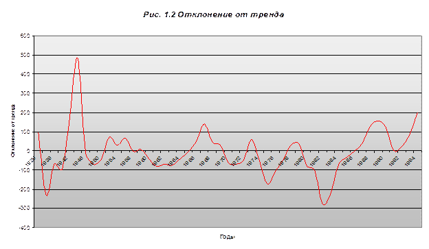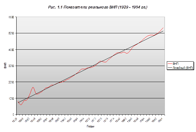 Рассмотрим график изменения ВНП в период с 1929 по 1994 гг. Проведем тренд графика, т. е. построим линейный ВНП путем линейного сглаживания данных. Легко заметить, что тренд имеет положительный наклон, т. е. возрастает. Это значит, что в долгосрочном периоде ВНП увеличивается, несмотря на то, что это возрастание происходит неравномерно, т.е. на определенных временных промежутках график подвержен отклонениям от тренда. Следовательно, можно сказать, что графику присущи долговременный рост и циклические колебания. Учитывая, что экономика США – пример рыночной экономики, можно сделать вывод о том, что рыночная экономика способствует росту экономики в долгосрочном периоде, несмотря на нестабильность этого роста. На первый взгляд ожидания классиков сбываются, т. е. в долгосрочном периоде наблюдается стабильный рост, однако если присмотреться внимательней, то можно заметить достаточно продолжительные отрезки времени, в течение которых экономика находится в состоянии затяжной депрессии, т. е. рынок не в состоянии «самостоятельно» выйти из создавшегося кризиса. Таким образом, анализ развития экономики США в течение длительного периода времени эмпирически подтверждает несостоятельность утверждений классиков и неоклассиков относительно саморегулируемости рыночной экономики. Для того, чтобы наглядно показать цикличность развития рыночной экономики на примере США, я построил график отклонений значений ВНП от значений тренда в соответствующие годы.