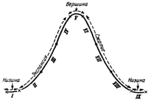 На рис. 1.3 схематически изображены циклические колебания ВВП и тренд. Тренд представляет собой график долгосрочного развития экономики, математически он является линейной апроксимизацией кривой ВВП. Положительный тренд показывает, что в целом экономика достигает определенного развития. Разные экономисты предлагают разные варианты фаз цикла. К. Маркс был одним из первых экономистов, который начал уделять этой проблеме пристальное внимание. Он выделял четыре фазы цикла, последовательно сменяющие друг друга: кризис (отрезок bc линии колебаний), депрессию (отрезок cd ), оживление (отрезок de) и подъем (отрезок ef). Причем, переломными являются точки – «пик» (b, f) и «дно» (d, h). Тогда расстояние между точками b и f или d и h называется продолжительностью цикла. Отрезок dd` или bb` называется амплитудой циклических колебаний. Приведу несколько других определений фаз цикла. К. Р. Макконнелл и С. Л. Брю выделяют следующие фазы цикла: пик (точка b на рис. 1.3), спад (отрезок bd), низшая точка спада (точка d) и подъем (отрезок df). Бернс и Митчелл [Bums A.F. and Mitchell W.C. Measuring Business Cycles. National Bureau of Economic Research. New York, 1946.] рассматривают вершины (точки b, f) и низины (точки d, h) как критические разграничительные пункты цикла. С этих позиций наиболее продолжительная часть цикла может быть разделена на два главных отрезка: фазу экспансии (expansion) – отрезок df, простирающуюся от низины до вершины, и фазу сжатия (contraction) – отрезок fh, простирающуюся от вершины до низины. Существуют, кроме того, поворотные точки, верхняя (точка f) и нижняя (точка d), представляющие собой относительно короткие периоды времени. На нижней поворотной точке счастливым образом возникает оживление (revival) и быстро перерастает в длительную фазу экспансии. На верхней поворотной точке рецессия (recession) овладевает экономикой и вскоре развертывается в фазу сжатия. Цикл рассматривается, таким образом, как состоящий из четырех тесно связанных между собой фаз: оживления, экспансии, рецессии и сжатия. В своей работе "Измерение промышленных циклов" Бернс и Митчелл подразделяют каждый законченный цикл, от низины до низины включительно, на девять стадий. Низина, с которой цикл начинается, обозначается римской цифрой I, низина, которой цикл завершается, — цифрой IX, а вершина — цифрой V. Фаза "экспансия" подразделяется на три стадии, обозначаемые цифрами II, III и IV; фаза "сжатие" подобным же образом подразделяется на три стадии, обозначаемые цифрами VI, VII и VIII. Эта модель может быть графически изображена так, как это сделано на рис. 1.4. Рис. 1.4 Ориентировочные периоды