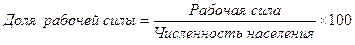 Безработными считаются те лица трудоспособного возраста, которые на данный момент не имеют работы, выходят на рынок труда и ведут активный ее поиск. Лица, имеющие работу, а также лица, занятые неполный рабочий день или неделю, относятся к категории занятых. В каждой стране законодательно установлено условие, при соблюдении которого трудоспособное лицо относится к группе безработных. Например, в США человек считается безработным, если он не работал последнюю неделю, но искал работу в течение последних 4 недель. Для трудоустройства безработных требуется определенное время. Оно различно у разных лиц. Продолжительность безработицы есть время, в течение которого человек остается безработным. Основную часть безработных составляют лица, трудоустройство которых растягивается на большой промежуток времени. Доля рабочей силы в общей численности населения равна отношению численности рабочей силы ко всему населению и подсчитывается по формуле: