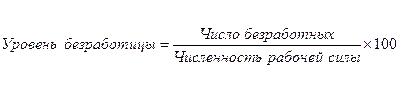 Уровень безработицы – это отношение числа безработных к численности совокупной рабочей силы, выраженное в процентах. Уровень безработицы расчитывается по следующей формуле: