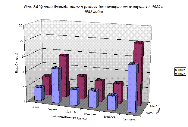 Источник: Н. Г. Мэнкью Принципы макроэкономики, 2003 Разделим данные на группы по трем критериям: полу, расе и возрасту. Рассмотрим значения уровня безработицы при полной занятости (1989 г.) и в период спада (1992 г.). Анализ данных представлен в виде таблицы 2.2. Табл. 2.2 Показатели параметров рынка труда США в 1989 и 1992 годах