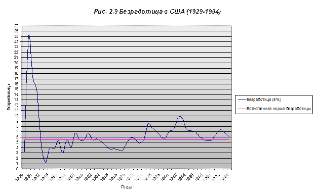 Как мы и предпологалали уровень безработицы во всех группах увеличился во время спада. Также практически сохранилась структура распределения безработицы между различными группами. Однако тут необходимо сделать два замечания: 1. Уровень безработицы среди молодежи увеличился больше, чем в других демографических группах. Это объясняется прежде всего тем, что молодежь более чувствительна к спадам в экономике и следующим за ним массовыми увольнениям. 2. В 1989 г. безработица среди женщин была выше, чем среди мужчин. Однако в кризисном 1992 г. ситуация меняется: безработица среди мужчин становится больше, чем среди женщин. Что подтверждает наши выводы о том, что циклические спады больше отражаются на уменьшении объема производства и занятости в отраслях, производящих товары долговременного пользования и инвестиционные товары. Именно в этих отраслях доля рабочих-мужчин несравненно больше доли женщин. В заключение рассмотрим понятие «естественный уровень безработицы». Дело в том, что определенный уровень безработицы считается нормальным или естественным. Естественный уровень безработицы называют также уровнем безработицы при полной занятости, то есть естественный уровень безработицы – это уровень безработицы при нулевой циклической безработице. Иными словами, естественный уровень безработицы равен сумме фрикционной и структурной безработицы. Почему этот уровень безработицы называют естественным? Потому что в рыночной экономике естественная безработица неизбежна, ведь многие работники добровольно меняют место работы, други проходят курсы переподготовки с целью трудоустроится на лучшую работу. Колебания же фактического уровня безработицы происходят вокруг естественного уровня. На рис. 2.9 приведен фактический уровень безработицы и ее естественный уровень в США.