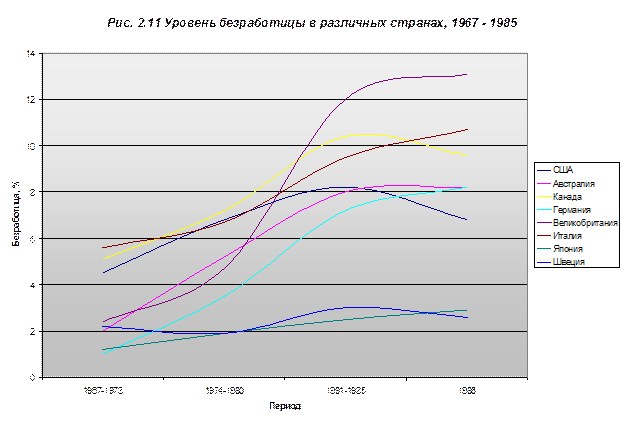 Источник: С. Фишер, Р. Дорнбуш, Р. Шмалензи Экономика, Москва, 1997 В чем же причина увеличения уровня безработицы в Западной Европе такими быстрыми темпами? Дело в том, что в отличие от США, где создание новых мест шло за счет увеличени низкооплачиваемых мест в сфере услуг, в Европе рабочие места не создавались темпами, соответствующими темпам роста предложения труда. Диаграмма, изображенная на рис.2.11, построена на основе данных из табл. 2.3 и наглядно показывает динамику изменений уровня безработицы в развитых странах.