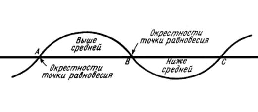 Бернс и Митчелл стремятся вначале обнаружить низины и вершины общей экономической активности. Вслед за этим изучаемый промежуток между вершиной и низинами подразделяется на периоды общей экспансии и общего сжатия, как это показано выше на примере цикла 1904-1908 гг.; то же относится и к любому другому циклу. После установления определенных хронологических границ вершин и низин последовательных экономических циклов исследуется поведение каждого частного статистического ряда (например, производства чугуна) в рамках циклов общей экономической активности. Другой экономист, Шумпетер, смотрит на структуру экономических циклов немного по-другому. Он считает, что критические точки следует искать не в вершинах и низинах цикла, а в точках перегиба (по его терминологии это «окрестности точки равновесия»). Модель цикла по Шумпетеру представлена на рисунке 1.5. Рис. 1.5 Модель цикла по Шумпетеру