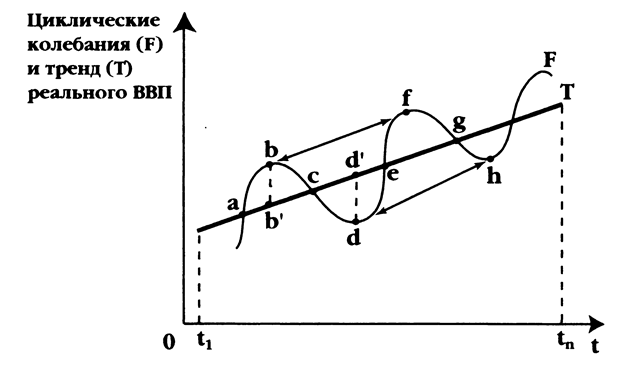 Эти колебания реального ВНП (ВВП) относительно тренда называются экономическими циклами. Существуют много определений экономического цикла, вот некоторые из них: «Экономический цикл (деловой цикл) – это периодические колебания уровня деловой активности, представленного реальным ВВП[5]» или «Экономические циклы это колебания совокупной экономической деятельности[6]». Некоторые экономисты считают, что термин «цикл» не подходит к колебаниям деловой активности, так как цикличность подразумевает наличие определенной закономерности в колебаниях, в то время как из рис. 1.1 и 1.2 видно, что найти такую закономерность достаточно затруднительно. Впрочем, среди экономистов не существует единого мнения насчет данного термина. Например, Грегори Мэнкью пишет: «Термин экономический (деловой) цикл, однако, может ввести нас в заблуждение, так как само понятие «цикл» предполагает, что краткосрочные колебания следуют регулярно, по некоей предсказуемой схеме. На самом деле подметить какую-либо систему в экономических флуктуациях (колебаниях – мое примеч.) и с достаточной степенью точности прогнозировать их характер вряд ли возможно[7]». В то же время один из крупнейших исследователей деловых циклов, лидер американских кейнсианцев Элвин Хансен в своем труде «Экономические циклы и национальный доход» пишет: «Вопрос о том, можно ли эти движения в строгом смысле определить как циклические, является по меньшей мере спорным. Иные стали бы защищать применение термина "колебания" как более точного, имея в виду то обстоятельство, что движения занятости, продукции и цен каждый раз так сильно меняются и обнаруживают столь частые отступления от правильного чередования. С другой стороны, те, кто стремится к теоретическим обобщениям и желает, насколько это возможно, использовать конкретные данные для создания модели или схемы, склонны искать в этих движениях больше правильности, чем это может быть выражено, строго говоря, термином "колебания"; и надо сказать, что приведенные данные в значительной степени подтверждают такую точку зрения[8]». Лично я считаю, что термин «колебания» больше подходит для определения данной экономической категории, если принять во внимание, что ни один из известных циклов в точности не повторяет другой – у каждого цикла свои уникальные особенности. Однако, несмотря на уникальность, каждый цикл проходит одни и те же фазы, именуемые по-разному различными экономистами. Рис. 1.3 Тренд и циклические колебания реального ВВП
