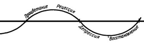 Точки А, В и С на рис. 1.5 представляют как раз эти точки перегиба, т. е. по Шумпетеру, окрестности точки равновесия. Шумпетер считал, что на отрезке АВ экономика работает с интенсивностью выше средней, и эти годы можно считать «хорошими», на отрезке же ВС экономика действует ниже своих производственных возможностей и поэтому эти годы он определил, как «плохие годы». Шумпетер выделял следующие четыре фазы цикла: процветание, рецессия, депрессия и восстановление (см рис. 1.6). Рис. 1.6 Фазы цикла по Шумпетеру