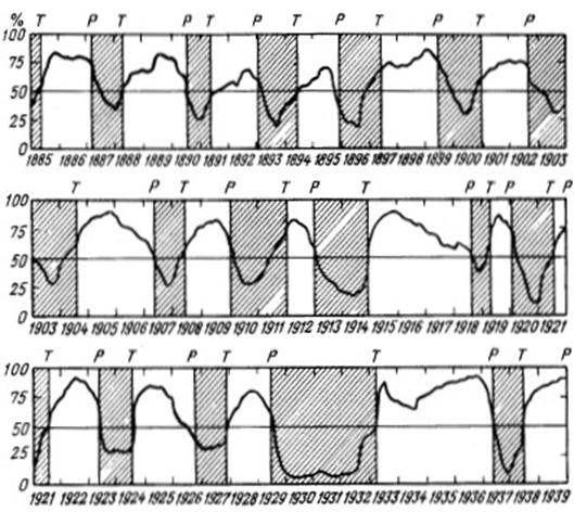 Обозначения: (-) – сокращение, (+) – увеличение, (*) – стабильное состояние. Данные экономические показатели используются для характеристики экономической конъюнктуры. В зависимости от того, как изменяется значение экономических параметров в ходе цикла, они делятся на проциклические, контрциклические и ациклические. Проциклические параметры в фазе подъема в фазе подъема увеличиваются, а в фазе спада уменьшаются (общий уровень цен, прибыли корпораций, агрегаты денежной массы и т. д.). Контрциклические параметры, наоборот, увеличиваются во время спада, а во время подъема уменьшается (уровень безработицы, число банкротств и т.д.) Ациклическими называются показатели, динамика которых не совпадает с фазами экономического цикла (например, объем экспорта). Кроме того различают три вида параметров по признаку синхронизации – опережающие, запаздывающие и соответсвующие. Опережающие достигают максимума или минимума перед приближением пика или низшей точки (изменения в запасах, денежной массе). Запаздывающие достигают максимума или минимума после пика или низшей точки (численность безработных, удельные расходы на зарплату и т. п.). Совпадающие параметры изменяются в соответсвии с колебанием экономической активности (ВНП, уровень инфляции, объем промышленного производства и т. п.). 1.2. Классификация и периодичность циклов Экономические циклы, несмотря на наличие у них общих фаз, обладают неповторимостью благодаря различным значениям параметров фаз (амплитуда, длина и т. д.). Это обстоятельство явилось причиной того, что еще с начала XIX в. разные экономисты выделяли различные экономические циклы. Эти циклы выделялись по признаку длины цикла. В этом вопросе, как впрочем и во многих других, касающихся деловых циклов, единого мнения среди экономистов не существует. Это и понятно, поскольку, по-моему, очень трудно «подстроить» все циклы под какой-то определенный тип, определенную временную рамку. Этот процесс «подстройки», по-моему, выглядит по меньшей мере искусственным. Выдвинутое положение также наглядно подтверждает следующий график, который показывает циклические фазы экспансии и сжатия. Другими словами, график изображает периодичность деловых циклов на примере Соединенных Штатов Америки в соответствии с хронологией, установленной Национальным бюро экономических исследований. Рис. 1.7 Циклические фазы экспансии и сжатия (кривая показывает, каков процент экономических временных рядов, испытывающих циклическую экспансию. Буквы Т и Р обозначают соответственно низины и вершины общего экономического цикла)