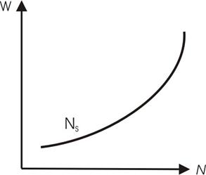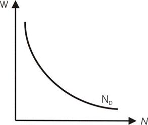 Где W – это ставка заработной платы, N – количество труда, предложенное при данной ставке заработной платы. Совокупный спрос на труд представляет собой общий, совместный спрос на услуги труда со стороны всех фирм и государства. Величина совокупного спроса на труд находится в обратной зависимости от ставки заработной платы. Поэтому график спроса имеет отрицательный наклон (рис. 2.2).