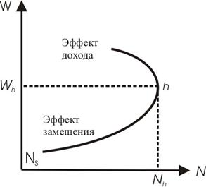 Однако индивидуальное предложение труда имеет некоторую особенность. Дело в том, что график индивидуального предложения труда имеет сначала положительный, а потом начиная с определенной точки отрицательный наклон. Этот своего рода феномен представлен на рис.2.3. Рис. 2.3 Эффект замещения и эффект дохода