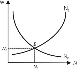 На рис. 2.3 начиная с точки h, график индивидуального предложения труда принимает отрицательный наклон. Дело в том, что, начиная с этой точки, эффектт дохода начинает преобладать над эффектом замещения, и работник начинает работать меньше за большую заработную плату. Следует отметить, что для кривой совокупного предложения данная закономерность не имеет места, т. к. для различных работников точка h разная и кроме того большая заработная плата приведет к притоку в отрасль рабочей силы из других отраслей. Как же определяется ставка заработной платы и занятость на рынке труда? Как и на других конкурентых рынках ресурсов равновесная ставка заработной платы и занятости устанавливается в результате взаимодействия спроса и предложения на рынке труда. На рис. 2.4 совмещены графики кривых спроса и предложения. Рис. 2.4 Равновесие на рынке труда