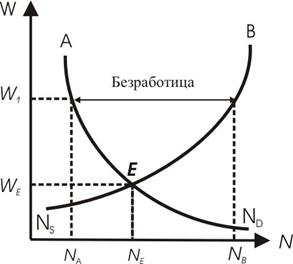 Точкой E на рис. 2.4 обозначена равновесная ставка заработной платы (WE) и занятости (NE). Данный вывод можно сделать, если предположить, что рынок труда чисто конкурентый рынок. Т. е. на рынке труда не действуют такие институты, как, например, профсоюзы или государство. Если же рынок труда не является чисто конкурентым, то может наблюдаться следующая ситуация, показанная в виде графика на рис. 2.5. Рис. 2.5 Возникновение безработицы на рынке труда