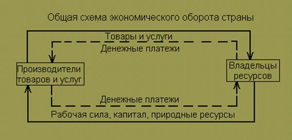 pис.1. На рис. 1 сплошной линией показано движение реальных потоков в экономике, а пунктирной - денежных потоков. В верхней части рисунка сплошная линия, направленная от производителей товаров и услуг к владельцам ресурсов (домашним хозяйствам, деловым фирмам и правительственному сектору), отражает стоимость тех товаров и услуг, которые владельцы ресурсов покупают у производителей товаров и услуг. Взамен /что показано пунктирной линией в обратном направлении/ население и правительственный сектор передают производителям товаров и услуг денежные средства в качестве платы за покупаемые товары и услуги. Сплошная линия в нижней части рисунка, направленная от владельцев ресурсов к производителям товаров и услуг, отражает стоимость тех ресурсов, которые производители товаров и услуг приобретают у владельцев ресурсов /факторов производства/, без которых не может быть осуществлен процесс производства, а именно: рабочей силы, капитала, природных ресурсов. В качестве платы за привлечение рабочей силы, капитала, природных ресурсов /что показано пунктирной линией в обратном направлении/ производители товаров и услуг передают владельцам ресурсов денежную плату в виде заработной платы, процентов, дивидендов, рентных платежей. Приведенная схема является в значительной мере упрощенной, т.к. она построена на основе условного предположения о равновесии экономической системы, когда все выходящие реальные и денежные потоки производителей товаров и услуг являются входящими реальными и денежными потоками владельцев ресурсов. Однако, в реальной действительности это не всегда так, поскольку, с одной стороны, не все денежные потоки могут возвращаться в экономический оборот, образуя "утечку" сбережений, а с другой стороны, на "вход" экономического оборота может поступать больший поток инвестиций в виде товаров и услуг по сравнению с потоком сбережений на "выходе" системы.