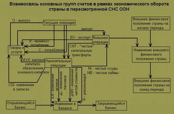 Однако рассматривается она в условиях возможного неравновесия экономической системы, а также с учетом связей с другими странами. Для условий неравновесной экономической системы характерно превышение сбережений над инвестициями или наоборот, что образует чистые ссуды или чистые займы. Кроме того, в СНС, в отличии от упрощенной схемы, показано, как в результате кругооборота и денежных потоков за исчисляемый промежуток времени изменяются богатство страны /активы/ и ее обязательства /пассивы/ по отношению к другим странам. Взаимосвязи основных групп счетов в рамках экономического оборота страны схематично можно представить на рис.2.