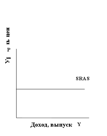 LRAS Долгосрочная кривая совокупного предложения. В конечном счёте, количество произведённой продукции определяется затратами труда и капитала и имеющейся технологией. Таким образом, оно не зависит от уровня цен. Долгосрочная кривая совокупного предложения (LRAS) вертикально. Краткосрочная кривая совокупного предложения. В данном случае принято экстремальные допущения о неизменности всех без исключения цен. Поэтому краткосрочная кривая совокупного предложения (SRAS) горизонтальна. |