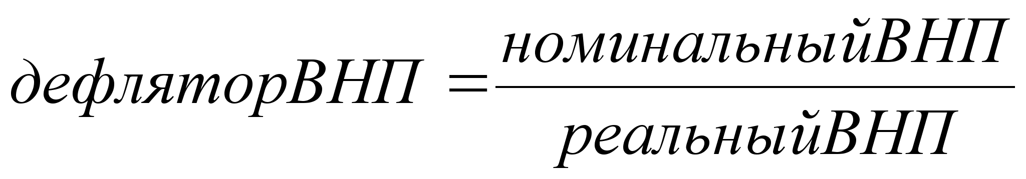 Таким образом, дефлятор ВНП есть отношение номинального объёма к реальному. Чтобы лучше уяснить, что такое реальный и номинальный объёмы ВНП и дефлятор ВНП, вернёмся к рассмотрению экономики, где производят только один вид товара – хлеб. Для любого года номинальный ВНП рассчитывается как общая сумма денег, истраченных на хлеб в этом году. Реальный ВНП – это количество произведённый в этом году буханок хлеба, умноженного на цену буханки хлеба в каком-то базисном году. Дефлятор ВНП – отношение цены буханки хлеба в этом году к цене буханки хлеба в базисном году. Вместе с тем, в реально существующей экономике производится значительно более широкое разнообразие товаров. Таким образом, в реальном и номинальном объёмах ВНП, а также в дефляторе ВНП представлено много различных цен и количественных показателей произведённой продукции. Введение понятия дефлятора ВНП позволяет выделить в составе номинального ВНП две части: одна характеризует количество произведенной продукции, а другая – цены. Номинальный объём ВНП = реальный объёмВНП x дефлятор ВНП. Номинальный ВНП даёт денежную очинку произведённой продукции. Реальный ВНП характеризует количество произведённой продукции, т.е. объём производства, измеренный в постоянных ценах (ценах базисного года). Дефлятор ВНП показывает изменение цены единого продукта в отчётном году по отношению к базисному. Вывод: