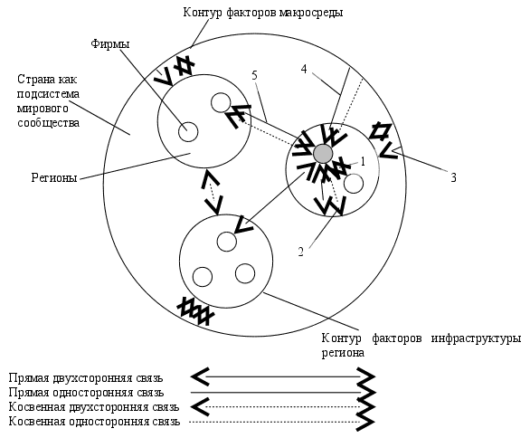 Р На рис 1 показаны прямые или косвенные связи между фирмами внутри региона (1), влияние факторов инфраструктуры региона на устойчивость и эффективность фирмы (2), факторов макросреды на эффективность и качество работы региона (3), факторов макросреды на устойчивость и эффективность работы фирмы (4) и факторов взаимодействия фирм разных регионов по различным вопросам (6). Односторонняя прямая связь между контуром факторов макросреды и инфраструктуры региона (3) означает законодательное и налоговое воздействие федеральных органов управления страны на регион, косвенная двухсторонняя связь между этими контурами означает взаимное влияние по другим факторам (см.таблицу 1). Микросреда фирмыК факторам прямого воздействия внешней среды на устойчивость и эффективность функционирования фирмы или к факторам микросреды относятся следующие: – вход системы (поставщики сырья, материалов, информации и других ресурсов); – потребители товара; – конкуренты; – контактные аудитории; – маркетинговые посредники; – законодательства по налоговой системе и внешнеэкономической деятельности В таблице 2 перечислены факторы микросреды фирмы и показатели, влияющие на эти факторы. Таблица 2 Факторы и показатели микросреды фирмы