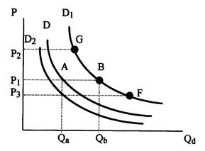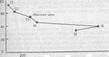 В случае изменения факторов, влияющих на величину Qd, могут меняться взаимоотношения между Qd и Р. Пусть по цене Р1 домохозяйства приобретают некий товар в количестве Qа единиц (точка А кривой D). При возросшем доходе домохозяйства имеют возможность купить по цене Р1 уже больше товара (Qb). Можно полагать, что и по цене Р2, и по цене Р3 они станут приобретать большее количество товара. В этом случае говорят о сдвиге кривой вправо (кривая D1). Если под влиянием изменения какого-то фактора происходит снижение Qd , то кривая спроса сместится влево (кривая D2 ). Спрос на товар представлен всей кривой спроса. Сдвиг ее вправо отражает увеличение спроса, сдвиг влево — уменьшение спроса. 2.2.2 Методы оценки кривых спросаБольшинство фирм так или иначе стремятся проводить замеры изменений спроса. Различия в подходах к замерам диктуются типом рынка. В условиях чистой монополии кривая спроса свидетельствует о том, что спрос на товар обоснован ценой, которую фирма за него запрашивает. Однако с появлением одного или более конкурентов кривая спроса будет меняться в зависимости от того, остаются ли цены конкурентов постоянными или меняются. В данном случае мы будем считать, что они остаются неизменными. Для замера спроса необходимо провести его оценку при разных ценах. Па рисунке представлена оценка спроса на моторное масло «Квакер стейт». Спрос растет по мере снижения цены с 73 до 38 центов. Однако на уровне 32 центов он начинает падать, ибо люди думают, что масло слишком дешевое и может нанести ущерб автомобилю. Кривая спроса на моторное масло «Квакер стейт»