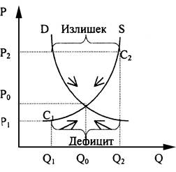 Предложение — количество товаров, находящихся на рынке или способных быть доставленными в короткие сроки. Отмечу, что между ценой и количеством предлагаемого продукта существует прямая зависимость: чем выше цена товара, тем больше его количество (при прочих равных условиях) будет произведено и предложено к реализации, и наоборот (рис). Отложив по вертикальной оси цену товара Р, по горизонтальной — величину предложения Q , получим кривую предложения, точки которой показывают количества товара или услуг, которые продавцы предлагают к продаже по разным цепам в течение определенного периода. По аналогии со сдвигом кривой спроса можно отметить, что под влиянием факторов, воздействующих на объем предлагаемого на рынке товара, происходит увеличение предлагаемого товара при каждом значении цены Р, в результате чего кривая S сместится вправо (кривая S1 — расширение предложения). Уменьшение Qs при каждом значении Р вызовет сдвиг кривой влево (кривая S2 — снижение предложения). Когда говорят о предложении, то имеют в виду всю кривую предложения. Сдвиг кривой S вправо или влево означает, что предложение меняется при той же цене. Если же ни один из факторов, влияющих на предложение, не меняется, а цена товара растет, то происходит перемещение по кривой S вверх или вниз (предложение товара не меняется). 2.2.4 Рыночные цены.Как уже говорилось, потребители при высоких ценах покупают меньше, чем при низких. Эта очевидная зависимость называется законом спроса. На графике кривая спроса является нисходящей (DD). В соответствии с законом предложения ясно, что производители сочтут выгодным направить большее количество ресурсов на производство товара при относительно более высоком уровне цены на него, чем при более низком. На графике эта прямая зависимость дает восходящую кривую предложения (SS). Пересечение кривых спроса и предложения определяет цену равновесия ( или рыночную цену) и равновесное количество продукции. Любую другую цену конкуренция сделает неустойчивой. [3]