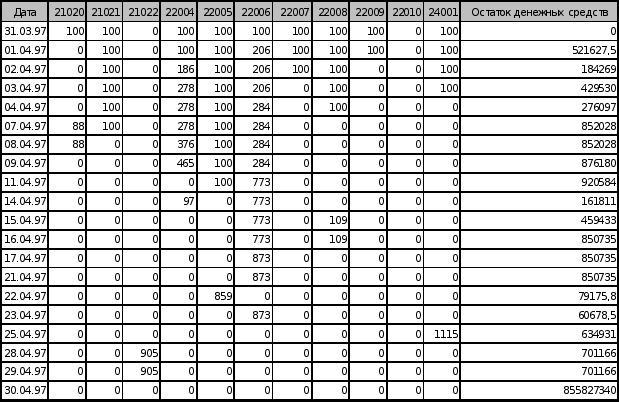 Следовательно, для данного примера метод дает положительный результат. Пример 2. Проанализируем метод на реальных данных. В Приложении 5 приведены последние цена и эффективная доходность, приведенная к месячной с учетом налога с доходов по ценным бумагам и с учетом комиссии биржи с 1 по 30 апреля 1997 по вторичным торгам на рынке РКО. Пусть в начальный момент времени есть консервативный портфель: количество бумаг каждой серии 100 штук(за исключением тех серий, которые размещаются в апреле). Начальная сумма денег = 0. Пусть каждый день может совершается только одна операция продажи-покупки. Придерживаясь предложенного метода получим следующие результаты(см. Таблицу 3) (в ячейках таблицы - количество бумаг на конец дня):