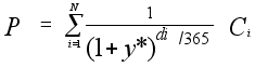 где Р — рыночная стоимость синтетической облигации (т.е. портфеля, состоящего из ГКО всех обращающихся выпусков); N — количество обращающихся выпусков ГКО; Ci — объем погашения i-го выпуска ГКО; у* — доходность к погашению синтетической облигации — обобщенная рыночная доходность (с учетом реинвестирования “купонов”); di — количество дней до погашения i-го выпуска ГКО.