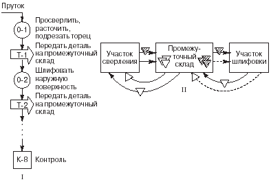 При Кинт = 1 применение методов группового производства наиболее эффективно. · Разработка маршрутной карты производственного процесса. Маршрутная карта представляет собой графическое изображение последовательности всех операций, включая перемещение материалов и их ожидание. · Разработка планировки цеха (участка). Планировка цеха (участка) составляется с учетом общего направления движения материалов. Необходимые данные берут из маршрутной карты производственного процесса. Расстановка оборудования производится по существующим нормативам с максимальным соблюдением прямоточности. Метод организации синхронизированного производства. Основные принципы организации синхронизированного производства разработаны в 60-е годы в японской компания "Toyota". Метод синхронизированного производства интегрирует ряд традиционных функций организации производственных процессов: оперативного планирования, контроля складских запасов, управления качеством продукции. Суть метода в отказе от производства продукции крупными партиями и создании непрерывно-поточного многопредметного производства, в котором на всех стадиях производственного цикла требуемый узел или деталь поставляется к месту последующей операции точно в необходимое время. Поставленная цель реализуется путем создания групповых, многопредметных поточных линий и использования принципа вытягивания в управлении ходом производства. Основными правилами организации производственного процесса в этом случае являются:
