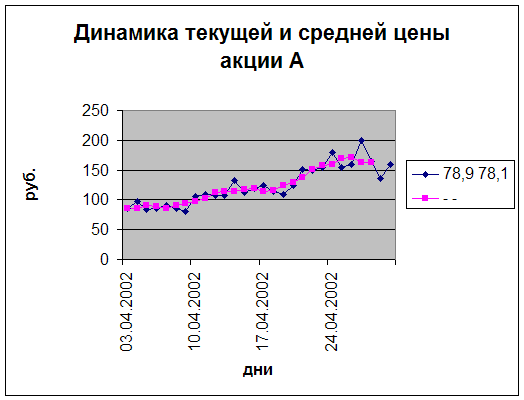 Метод скользящей средней широко применяется при техническом анализе конъюнктуры рынков, в частности валютных и биржевых. Фондовые индикаторы и индексы применяются для анализа общего движения курсов ценных бумаг во времени. Умение толковать различные рыночные индикаторы помогает инвестору не только ориентироваться в финансовых инструментах, но и безошибочно выбирать время совершения сделок. Нужно не только понимать общий ход экономической конъюнктуры, но и видеть, насколько благоприятна конъюнктура фондового рынка. Инвестор вкладывает деньги в конкретную ценную бумагу, поэтому должен знать, как изменяется динамика рынка. Для оценки поведения фондового рынка обычно обращаются к изучению рыночных индикаторов и индексов. Средние индикаторы – это средние арифметические показатели курсов репрезентативной группы акций в данный момент; индексы –измеряют текущую динамику курсов репрезентативной группы акций по сравнению с базовой величиной, рассчитанный на некоторый момент в прошлом. Инвесторы часто сравнивают средние индикаторы или индексы на определенный момент, пытаясь таким способом определить относительную силу или слабость рынка. Когда средние индикаторы или индексы показывают общее движение курсов вверх, рынок называют рынком «быков», когда же движение направлено вниз, - рынком «медведей». Основные средние индикаторы следует знать, так как они удобны для определения общей тенденции фондового рынка. В сводках финансовых новостей ежедневно даются значения средних индикаторов на данный день и за последнее время, они цитируются также в большинстве местных газет и выпусках новостей по радио и телевидению , на различных сайтах в интернете, например http://www.finam.ru/, http://www.rbc.ru/fm_wi.shtml . Например, средняя Доу Джонса для промышленных акций (DJIA) – это средняя курсов 30 акций высококлассных промышленных компаний, отобранных по критериям рыночной стоимости и степени распространения среди широкого круга владельцев, в силу чего они считаются репрезентативными для общей динамики рынка ценных бумаг. Основные мировые фондовые индексы я показала в приложении 1 по последним данным фондового рынка с сайта компании «РосБизнес Консалтинг», которые обновляются каждые 20 минут. В приложении 2 я показала динамику изменения цены акции РАО ЕЭС на Московской международной валютной бирже (ММВБ). Скользящие средние является инструментами технического анализа, сглаживающими колебания изучаемой величины путем усреднения по некоторому историческому периоду. Служат для выявления трендов. Недостатком скользящих средних является запаздывание усредненных значений по отношению к курсу изучаемой величины Скользящие средние различаются методом усреднения. -
