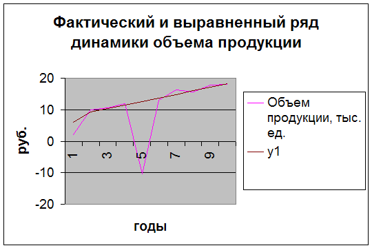 График фактических и скользящих пятичленных средних цен, где 1- график фактических цен; 2- график исчисленных скользящих пятичленных средних цен. Из графика видно, что при значительных колебаниях фактических цен скользящая пятичленная средняя имеет ярко выраженную повышательную тенденцию. 2. Аналитическое выравнивания ряда динамики по прямой. Рассмотрим применение метода на следующих данных о производстве продукции предприятием ОАО «Технополис»: