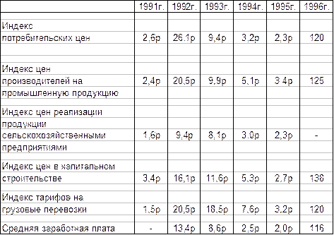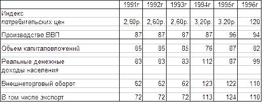 В качестве обобщающего показателя инфляции принято использовать индекс потребительских цен, динамика которого характеризует изменение уровня цен на самый крупный элемент использования ВВП – потребительские расходы домашних хозяйств, составляющие более половины его объема. В числе макроэкономических показателей приведены четыре: ВВП как показатель динамики общего объема производства товаров и услуг; капиталовложения за счет всех источников финансирования как индикатор инвестиционной активности; реальные денежные доходы населения как основной параметр изменения конечного потребительского спроса и уровня потребления населения с выделением показателя реальной заработной платы; внешнеторговый оборот как показатель объема внешнеэкономической деятельности. Это позволяет сравнить уровень инфляции с динамикой производства ВВП и трех основных элементов конечного спроса – реальных доходов населения, расходов на инвестиции и экспорта. Из таблицы вытекают следующие выводы. Пик инфляции приходится на начало реформ (1992г.), затем ее темпы замедлились и в настоящее время составляют менее 1% в месяц ( в 1992-1994гг. они измерялись двузначными числами). Снижение инфляции сопровождалось уменьшением спада производства. Так, на старте реформ производство ВВП сократилось в 1992г. на 19%, в 1993-1994гг. глубина спада находилась на уровне 12-13% и в 1995г. уменьшилось в 3 раза ( до 4%), но в 1996г. вновь увеличились. Гораздо слабее снижение инфляции воздействовало на торможение спада инвестиций, глубина которого в 2-3 раза больше сокращения общего уровня производства, в том числе и сегодня. Более существенным оказалось влияние снижения инфляции на стабилизацию покупательной способности и потребительского спроса населения. в целом за рассматриваемый период реальные денежные доходы населения сократились несколько меньше, чем общий уровень производства, что говорит об определенном перераспределении ресурсов на цели потребления, преимущественно для компенсации негативных социальных издержек реформ. В 1996г. замедление инфляции дополнилось стабилизацией размеров реальных денежных доходов населения. Быстрее всего ее снижение воздействовало на стабилизацию внешнеэкономической деятельностью. Сокращение внешнеторгового оборота со странами дальнего зарубежья приостановилось на втором году реформ. В течение трех последних лет объем торговли с этими странами в долларовом изменении увеличивается. В 1996г. обозначилось также расширение в долларовом эквиваленте торговли со странами СНГ. Маховик инфляции (инфляционная спираль) был во многом раскручен в результате применения необилеральной монета риской концепции реформ. Они были развернуты под очевидным влиянием, попытки применить, в России традиционную и в общем стандартную практику экономического либерализма, который придерживается в своей деятельности МВФ, Всемирный банк, правительства США, Англии и нескольких других западных государств. В основе этой практики лежит идея саморегулирования рынка и минимизации участия государства в управлении экономикой. Опыт других индустриального развития стран (ФРГ, Франции, Японии), где наряду с механизмом конкуренции широко используется система государственного регулирования рынка, был признан для российских условий менее подходящим. Объяснялось это в
