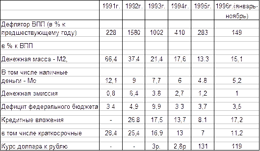 Всплеск инфляции в 1992г. трудно подтвердить цифрами по всем содержащимся в таблице показателям, так как некоторые из них ранее не исчислялись либо их уровень был предопределен преобладанием нерыночной экономической обстановки. Зато довольно отчетливо просматривается замедление роста дефлятора ВВП и влияние на снижение уровня инфляции применения всех рассматриваемых далее рычагов «умеренно жесткой» (по оценке ее разработчиков) ограничительной денежной, бюджетной и кредитной политики.