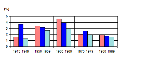 В 70х годах прошлого столетия шведские железная руда и лес были необходимы для индустриализации Европы. Расширение шведского экспорта способствовало индустриализации страны и росту городского населения, что в свою очередь привело к развитию сети железных дорог и строительства. На основе шведских изобретений создавались и быстро росли новые компании в металлургии и машиностроении. Хотя по-прежнему доминировали лесопильная и железорудная отрасли, быстро развивались целлюлозно-бумажная промышленность и машиностроение. Доля рабочей силы, занятой в промышленности, с 1870 по 1913 г. выросла с 15 до 34%. К началу первой мировой войны на сельское хозяйство все еще приходилась половина работающего населения. В условиях быстрого роста населения важное значение имела эмиграция, прежде всего в Северную Америку. В 18601930 гг. страну покинули 1, 2 млн. шведов. Эмиграция позволила избежать голода и массовой безработицы. Швеция избежала участия в обеих мировых войнах, что позволило не только сохранить производственный потенциал и трудовые ресурсы, но и значительно обогатиться на поставках воюющим странам и при восстановлении европейской экономики. В межвоенный период Швеция по темпам роста ВПП уступала только США. Однако серьезный удар по экономике нанесли два глубоких экономических кризиса: в 19211922 гг. вследствие дефляции после первой мировой войны, что привело к падению промышленного производства на 25% ниже уровня 1913 г., и в начале 30х годов, когда безработица среди членов профсоюзов в 1933 г. составляла 25%. В послевоенный период экономика Швеции развивалась быстрыми темпами. Это были ее “золотые” годы. Главным фактором этого развития был экспорт. Рост производительности труда составлял в среднем в год 5, 1% в первой половине 60х годов и 4, 3% в 19651974 гг. Это объяснялось значительными капиталовложениями и успехами в политике занятости. В 70е годы темпы роста упали. После энергетического кризиса 19731974 гг. в промышленности страны возник ряд серьезных проблем. В значительной степени это стало следствием весьма глубокого и продолжительного мирового кризиса середины 70х годов. Швецию поразили глубокие структурные кризисы. Около 25% промышленного производства приходилось на отрасли, пораженные кризисом: горнодобывающую, черную металлургию, лесную и судостроение. Возросла международная конкуренция. На мировой рынок вышли страны с низкими трудовыми издержками. Сократились издержки на транспорт. Резко возросли цены на нефть. В тоже время конкурентоспособность шведской промышленности резко снизилась в 19751976 гг., когда издержки на рабочую силу возросли примерно на 40%. В результате шведская промышленность потеряла за 19751977 гг. почти 20% своей доли на мировом рынке. Избыток мощностей и низкий мировой спрос на чугун и сталь отрицательно отразились на черной металлургии Швеции. Лесная промышленность теряла свои позиции под натиском конкурентов, прежде всего из Северной Америки. Большой мировой избыток мировых мощностей в судостроении в сочетании со слабым спросом как на новые суда, так и на фрахтование резко сократил выпуск судов в Швеции. Производство обуви и одежды испытывало очень серьезную конкуренцию со стороны некоторых развивающихся стран, где издержки на рабочую силу были значительно ниже, чем в Швеции . Чтобы избежать слишком резких структурных сдви
