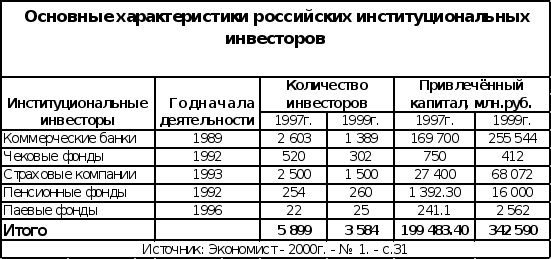 При этом процесс формирования инвестиционных институтов российского фондового рынка отличается некоторыми особенностями, в частности, наличием ограничительных рамок развития конкретного направления инвестиционной деятельности, что дифференцирует уровень привлекательности институциональных инвесторов по показателям надежности, ликвидности и доходности. На сегодняшний день наиболее привлекательным с точки зрения надежности и ликвидности вложений выглядит накопление средств страховой компании. Именно это институциональная структура обеспечивает возвратность инвестиций обязательным резервированием средств самой компанией. Вложения компенсируют потери при наступлении страхового случая, что является условием сохранности и ликвидности средств. Однако доходность вложений в страховые компании по сравнению с другими структурами ниже. Таким образом, по критериям надежности и эффективности инвестиции среди российских институциональных инвесторов на первом месте стоят страховые компании, что подтверждается и количественными показателями функционирования данного институционального инвестора. (следует отметить, что финансовый кризис оказал весьма негативное воздействие на деятельность страховых компаний, объемы привлеченного ими капитала в долларовом исчислении значительно сократились.) На втором месте по условиям инвестированиям находятся коммерческие банки. Соотношение оборота рынка институциональных инвестиций 1999г. и суммы накоплений населения страны составляет около 15%, в то время как в странах с развитым рынком капитала через этот сектор проходит порядка 1\3 общего оборота капитала. Доля сбережений населения в обороте инвестиционного капитала пока остается невысокой. Это создает огромные потенциальные возможности для развития в России рынка институциональных инвестиций. (Таблица 2.) По состоянию на конец 2000 г. (за 1991-1999 гг. и 2000 г.) накопленный иностранный капитал в экономике России составил 32,0 млрд. долларов США (здесь и далее данные приведены без учета органов денежно-кредитного регулирования, коммерческих и сберегательных банков, включая рублевые поступления, пересчитанные в доллары США). Доля прямых инвестиций составила 50,4%, портфельных -1,6, прочих - 48,0%. 1 В 2000 г. объем поступившего иностранного капитала составил 114,6% от объема предыдущего года, или 11,0 млрд. долларов США. В 2000 г. изменилась структура иностранного капитала, поступившего в Россию. Так, при снижении доли прямых инвестиций на 4,2 процентного пункта по сравнению с 1999 г. доля прочих инвестиций возросла на 3,2 процентного пункта.1 По-прежнему привлекательными для иностранных инвесторов остаются предприятия и организации транспорта, где объем иностранных инвестиций возрос в 2000 г. по сравнению с 1999 г. почти в 2,0 раза, связи - в 2,4 раза, пищевой промышленности - на 26,3%, торговли и общественного питания - на 20,5%. Вместе с тем снизились объемы иностранных инвестиций в такую привлекательную ранее для иностранных инвесторов отрасль, как топливная промышленность (на 63,5%). Общая величина прямых инвестиций в транспорт, торговлю и общественное питание, пищевую промышленность, а также топливную промышленность составила в 2000 г. 3,0 млрд. долларов США, или 68,8% всех прямых вложений.1 Следует отметить, что отраслевые предпочтения иностранных инвесторов определ