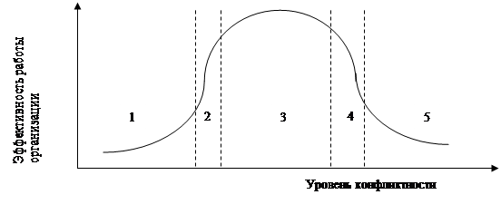 Таким образом, при одинаковых финансовых, налоговых и др. внешних условиях существования организаций на рынке, зависимость эффективности от уровня конфликтности будет выглядеть приметно так же, как вышеприведенный график, где положительным функциям конфликта будет соответствовать высокая, а отрицательным – низкая эффективность работы организации. Тогда: 1 – «болото»; 2 – разногласия; 3 – продуктивная напряженность; 4 – скрытое недовольство; 5 – конфронтация.