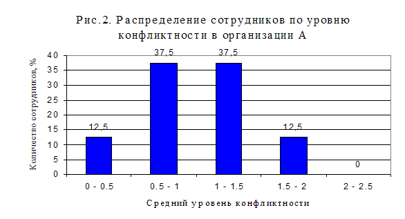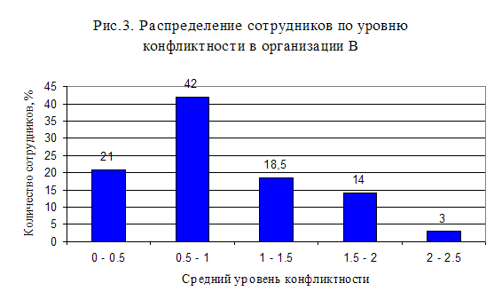 Распределение среднего уровня конфликтности сотрудников в организациях А и В представлено на рис.2 и 3. В первом случае мы имеем дело с нормальным распределением, во втором с распределением, близким к распределению Пуассона. Центр тяжести нормального распределения соответствует большему значению уровня конфликтности, чем центр тяжести распределения Пуассона. Таким образом можно сказать, что уровень конфликтности в организации А выше, чем в организации В.