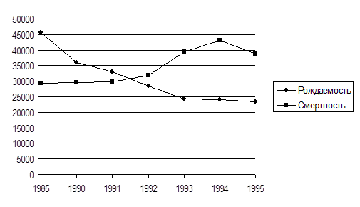 Динамика смертности и рождаемости представлена графиком Как видно из трафика рождаемость в НСО падает, и по прогнозам демографов то что мы наблюдаем на графике – это не предел. Уровень рождаемости имеет стойкую тенденцию к понижению, это можно объяснить слабым развитием материально-социальной базы. Однако, руководство области приняло ряд программ направленных на улучшение качества жизни населения и поддержание социальных программ, по защите материнства и детства. Однако эти программы ещё не успели «набрать обороты» и в связи с этим падение уровня рождаемости сохранится ещё некоторое время. Однако смертность, начиная с 1994 года, тоже падает, это демографы так же прогнозируют. Это один из тех утешительных моментов, на которые учёные обращают внимание. Число родившихся в НСО