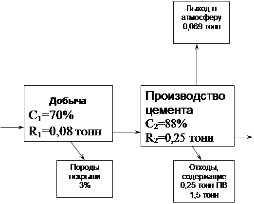 Исходя из данного способа вычисления, конкретно для нашего результирующего зонирования. Получилось что в первую группу входит всего одна зона, № 40, и во вторую группу одна зона, №32. Однако, учитывая короткий интервал от минимума до максимума и большое количество зон, мы выделили в среднюю группу с относительной благоприятностью зоны имеющие коэффициент поправки не более 2,07 Расчётная часть.Выявить наиболее рациональный вариант территориального размещения производственной цепочки по переработке глинозёма для производства цемента, руководствуясь критерием минимизации приведённых затрат. Размещается предприятие по производству глинозёмного цемента мощностью 500тыс. тонн в год. Производство осуществляется по двухуровневой технологической цепочке, включающей добычу цементного сырья, и производство готовой продукции – цемента. Коэффициент вскрыши равен 1,5 (на одну часть сырья приходится 1,5 пород вскрыши. Всего 2,5 части.) Содержание полезного вещества на первом звене технологической цепочке – 70%, на втором – 88%. Выброс вещества в атмосферу составит на выходе обоих звеньев 3%. Решение задачи складывается из нескольких этапов: 1. Определение движение полезного вещества по технологической цепочке. 2. Выбор рационального варианта размещения производства с учётом поправочного коэффициента к удельным капитальным вложениям.
